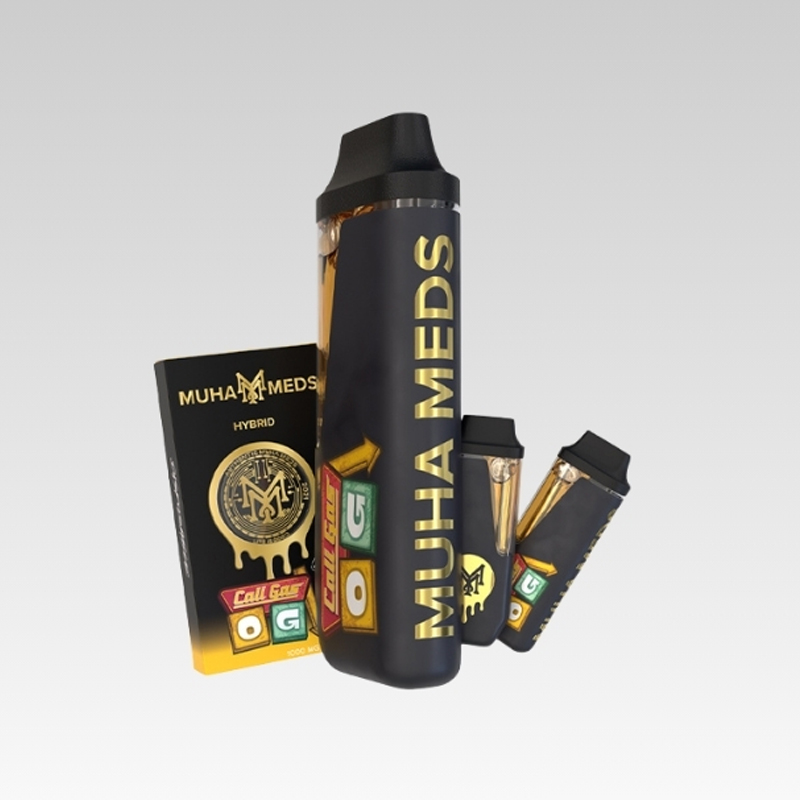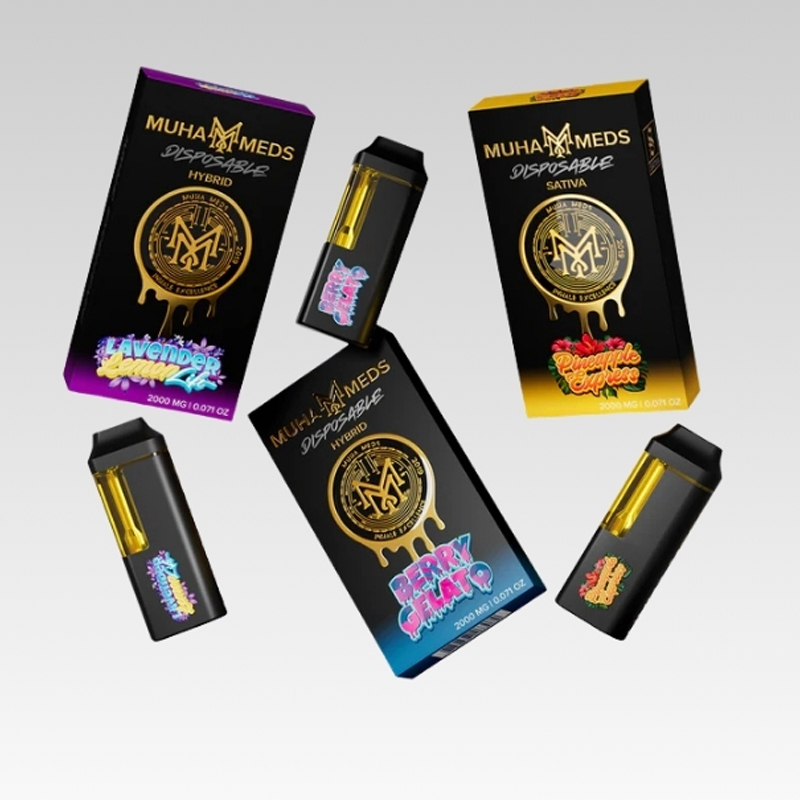 Vape desechable Muha Meds 2 gr con live rosin, 2000 mg de THC, perfiles de sabor por cepa, listo para usar.